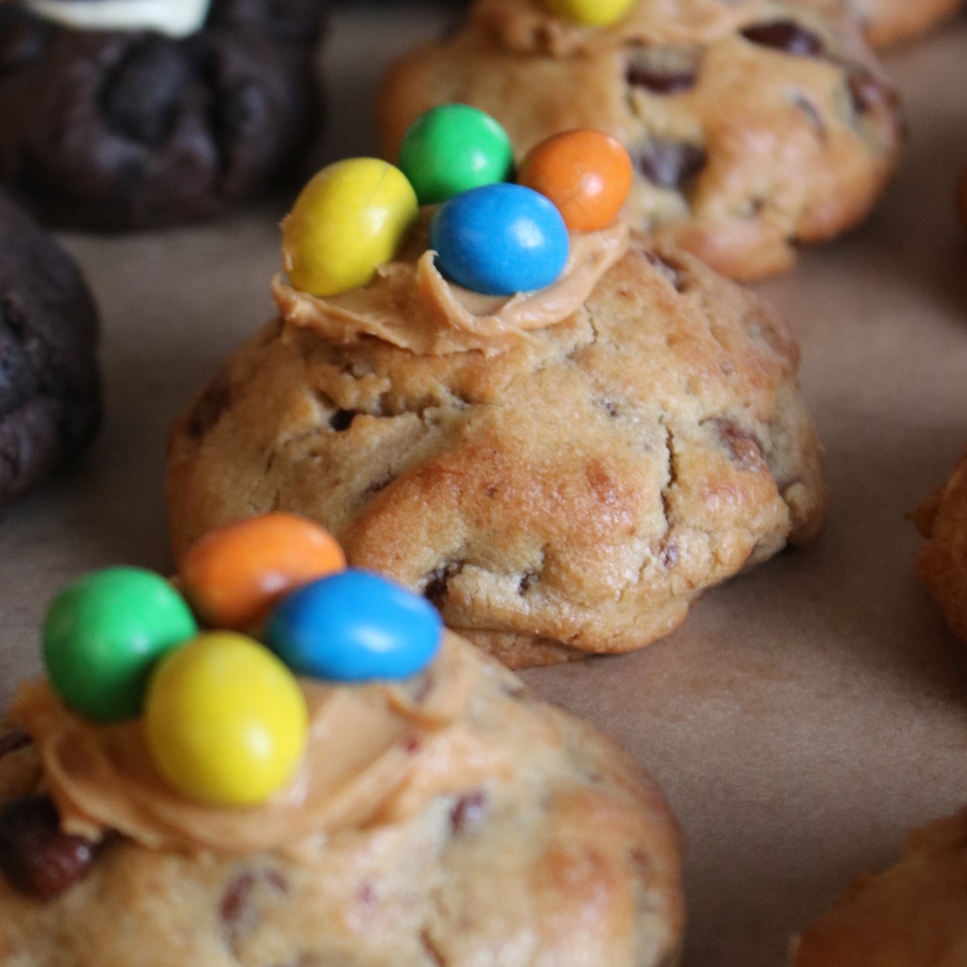 Vanillukökudeig með súkkulaðibitum, fyllt með rjómalöguðu hnetusmjöri.